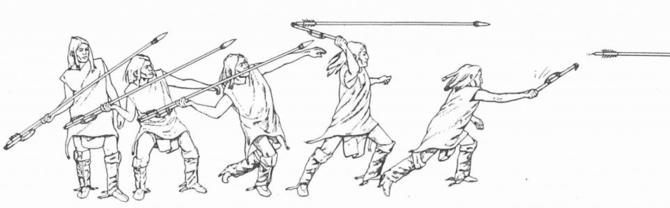 As they became men, Awaas and Mateg developed into well respected contributors to the hunt and its rituals. Mateg, the elder, was known for his high-quality precision stonework. In earlier years he had been granted knowledge of, and visited the quarries located in the distant Northern mountains. His signature creation was a large fluted projectile point that he would mount on a spear, or dart. It would be fastened to straight but flexible wooden sticks. These projectiles could be thrown by hand at a target. Smaller versions could be propelled by atlatls. Like bows, atlatls could pitch flexible pointed shafts — called darts, at high speeds across long distances. Atlatls were essentially wooden sticks that contained a hook or spur at one end. This notch would hold the dart or spear. By swinging the atlatl overhead and forward, the hunters could launch their darts with greater force than if they were to throw them like javelins.
